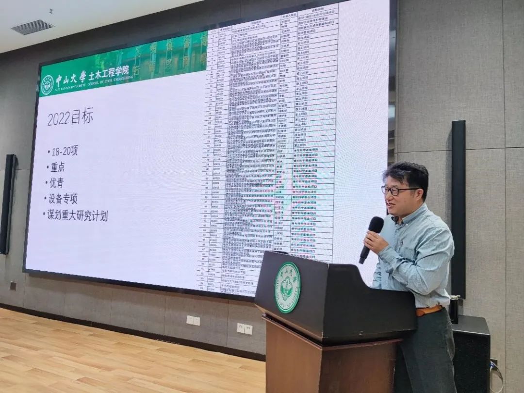 学院党委曹新书记在致辞中勉励学院教师在未来的科研工作中要凝练方向、坚定信心,发挥学院优势,突出“水土交融”特色,鼓励教师们多和国内外同行、相关行业企业进行广泛深入的交流与合作。他提出四点希望:一是未雨绸缪、及时准备,包括基金项目申报等各项科研工作要提前谋划和部署;二是个人努力、团队支持,青年教师要把个人兴趣与国家重大战略需求、学院重点发展方向、团队目标任务等相结合,团队要积极指导帮助青年教师尤其是新入职教师写好“本子”;三是集思广益、选准方向,建议大家自觉以“四个面向”为导向,服务粤港澳大湾区建设、海洋强国和生态文明建设等国家重大战略需求,发挥综合性大学多学科交叉融合的优势,加强跨学科交流合作,找准研究方向,经过一定时间的积累,逐步形成自身特色和优势;四是交流学术、构建文化,希望通过今天这样的科研项目报告交流、日常的学术讲座论坛、举办国际学术会议和卓越工程师讲座等,构建活跃的学院文化氛围,增强文化引才的吸引力,进一步完善人才布局,培育优良学术生态,提升与兄弟院校、科研院所、行业企业的合作交流,不懈奋斗,努力建设中国特色世界一流的“大土木”工程学科。