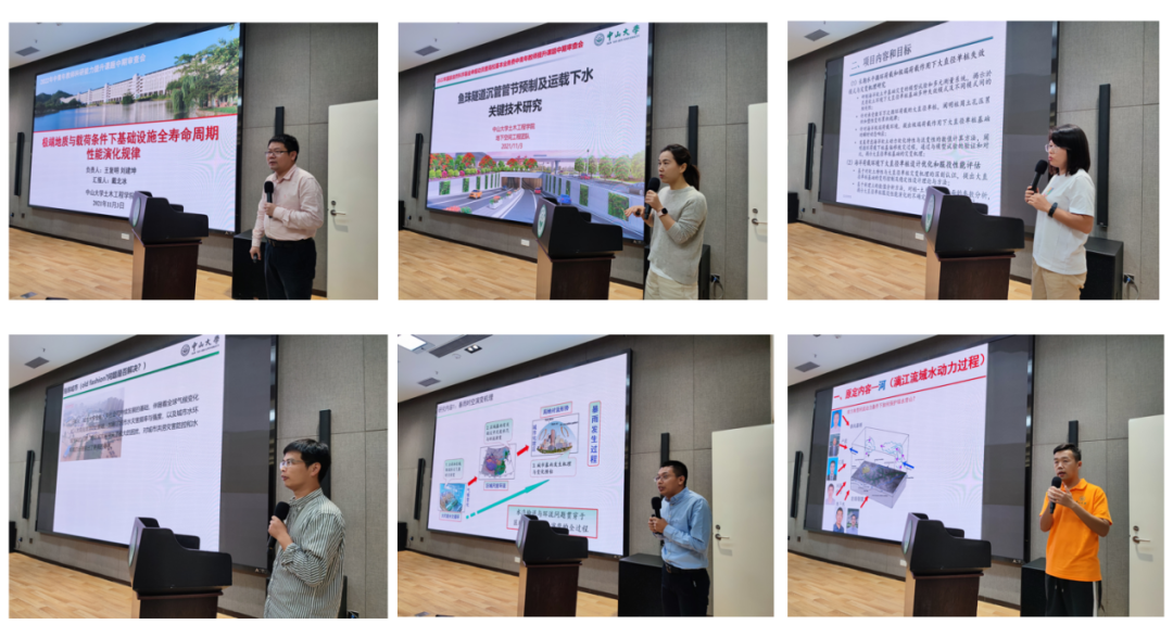 项目六个子课题的负责人围绕各自的科研主题向大会汇报了研究进展:戴北冰副教授代表基础设施运维团队汇报了《极端地质与载荷条件下基础设施全寿命周期性能演化规律》;马会环副教授代表地下空间工程团队汇报了《鱼珠隧道沉管管节预制及运载下水关键技术研究》;赵红芬副教授代表海洋土木工程团队汇报了《海洋环境荷载作用下大直径单桩基础在软土层中的灾变机理》;刘智勇副教授代表城市水务团队汇报了《海绵城市机理及模拟研究》;谭学志副教授代表水资源水生态团队汇报了《粤港澳大湾区水安全调控机理与技术研究》;俞烜副教授代表河海动力过程团队汇报了《河海动力过程驱动下物质输移监测进展》。