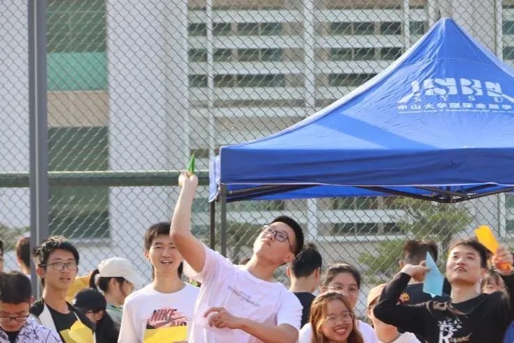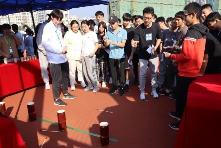 首先开展的是趣味个人赛和团体赛。每一个项目点都挤满了老师和同学。吹乒乓球、纸飞机、投壶、单车耐力赛,各摊位都时不时爆发出欢呼声。趣味性和挑战性兼具的比赛内容,让同学们都跃跃欲试。排队的同学迫不及待地翘首观望比赛现场,而闯关成功的同学则兴高采烈地分享自己的经验心得——“吹乒乓球,把那个杯子里的水加满,吹着就顺溜!”,“投壶,手要往前送!”......纸飞机项目则让师生们重温了童年的乐趣,各式各样彩纸卡纸折叠的飞机乘风起航,有的稳稳地飘过十米线,有的调皮地绕个弯“返航”回到起点;单车耐力赛中,平衡能力好的同学就占尽优势......丰富的项目妙趣横生,操场上不时传来师生们的欢笑声。