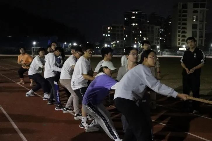 压轴的团体项目莫过于体现团结精神的拔河。每个班选派选手,错位站在绳子的两端,向后侧倾斜身子,双手紧握、蓄势待发,随着裁判员一声令下,排山倒海般的加油呐喊声在操场响起,选手们都憋足了劲往后拉,加油的同学则恨不得用意念把绳子拽过来。场上气氛达到高潮,“团结就是力量”此时得到了最好的体现。