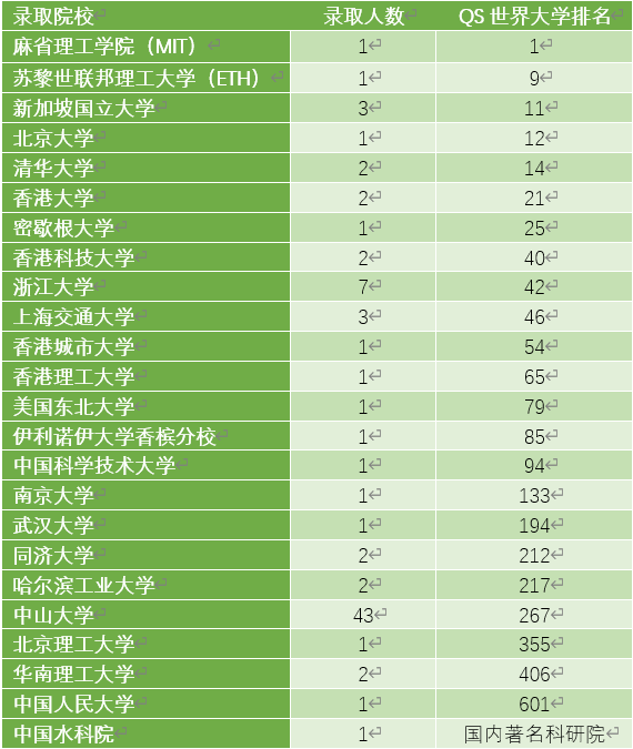 目前,已被世界前50名的著名大学录取的我院2022届本科毕业生有23人,深造高校包括排名世界第一的麻省理工学院(MIT),以及苏黎世联邦理工大学(ETH)、新加坡国立大学、清华大学、北京大学、香港大学、密歇根大学等顶尖名校。另外,有28人被排名世界前100名著名大学录取,升学深造本科毕业生中有94%比例的同学在排名世界前300名著名学府深造。