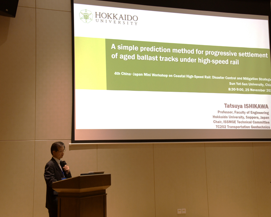 11月25日,我院在珠海校区海琴四号举办第四届中日滨海高铁岩土研讨会。此次研讨会是滨海基础设施灾变防控学科创新引智基地的系列活动之一,特邀了多位国内外专家学者,包括日本北海道大学的Tatsuya Ishikawa教授、横滨国立大学的Kimitoshi Hayano教授、日本铁道技术研究所的Takahisa Nakamura教授和Susumu Nakajima教授、同济大学的肖军华教授中南大学的陈晓斌教授和肖源杰教授、北京交通大学的李旭教授和沈宇鹏教授、石家庄铁道大学王天亮教授、西南交通大学王腾飞副教授、中国铁路设计集团有限公司张云龙高级工程师等。研讨会共14场特邀报告,会议由刘建坤教授主持。我院教师和研究生代表40多人参加。