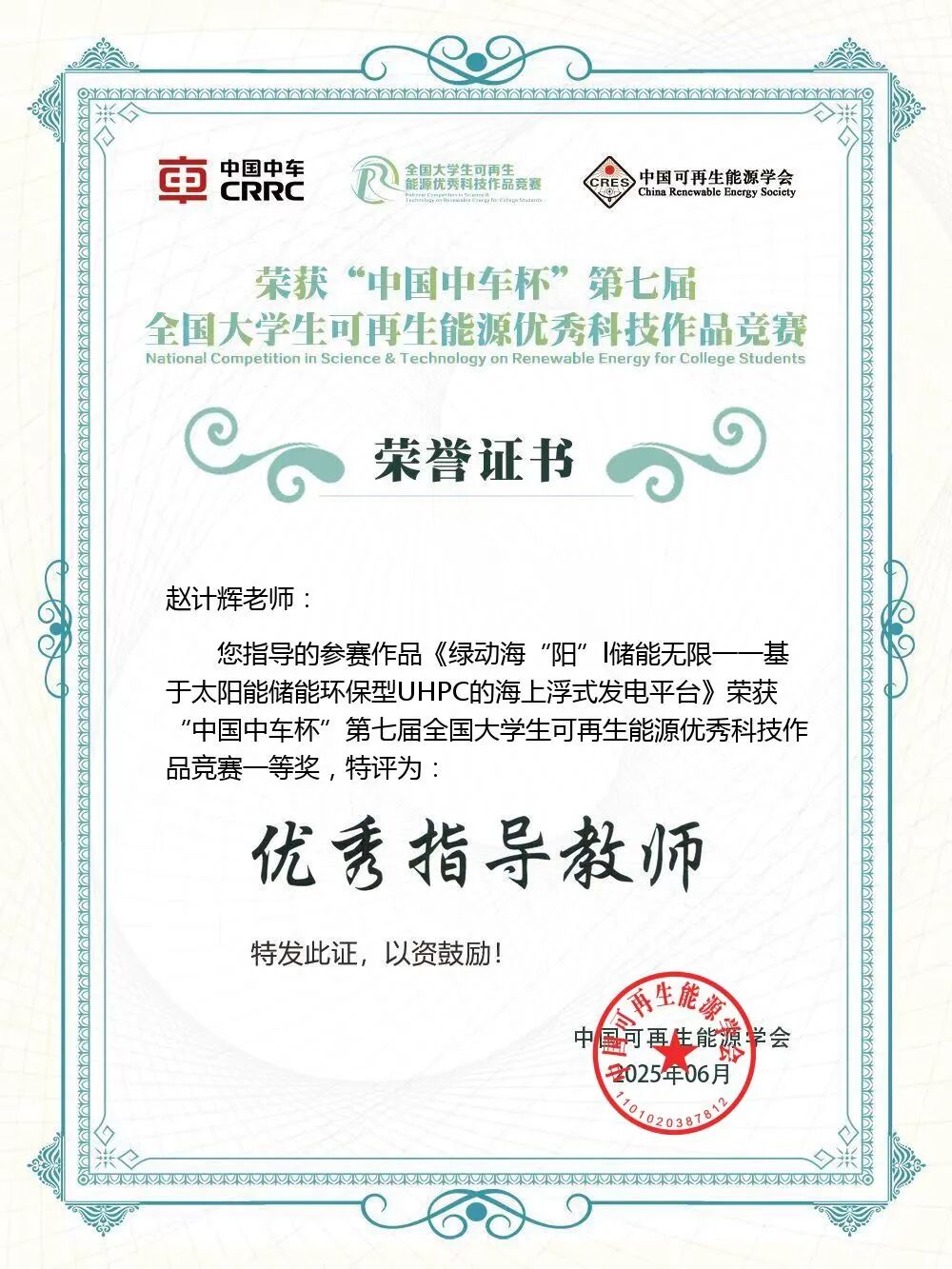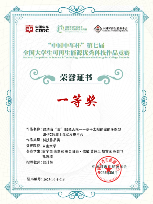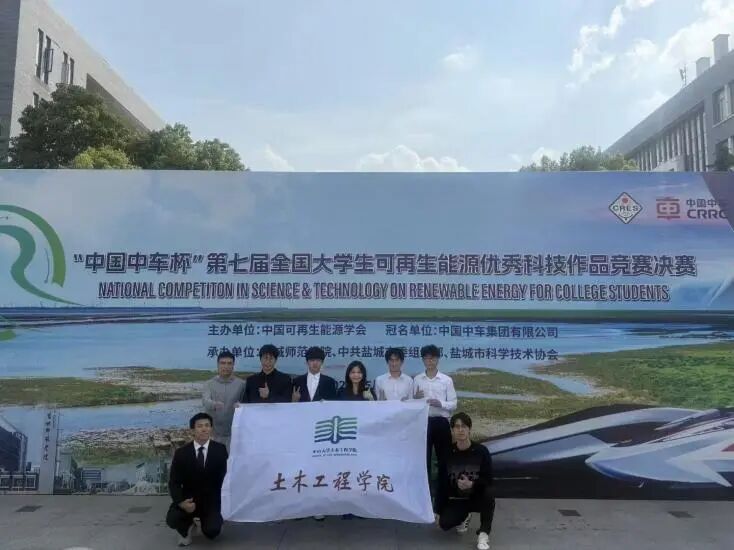 近日,由中国可再生能源学会主办的“中国中车杯”第七届全国大学生可再生能源优秀科技作品竞赛决赛在江苏省盐城市举行。本次竞赛共有来自全国305所高校的2013项作品参赛。我院2个本科生团队获得一等奖1项、三等奖1项,3个研究生团队获得三等奖3项。其中,本科生团队参赛项目《绿动海“阳”|储能无限——基于太阳能储能环保型UHPC的海上浮式发电平台》(参赛学生:翁宇杰、徐嘉君、美合日班·依敏、黄纤尘、胡首丞、程若飞、孙浩楠,指导教师:赵计辉)从众多作品中脱颖而出,荣获一等奖。
