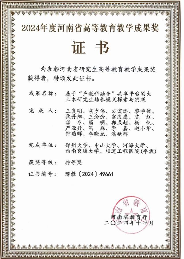 针对工科研究生培养过程中理论与实践脱节、创新能力不足等实践短板,学院开展“产科教融合”探索,聘任124名行业导师,参与研究生的全过程培养。联合申报的《基于“产科教融合”共享平台的大土木研究生培养模式探索与实践》获2024年度河南省高等教育教学成果特等奖。