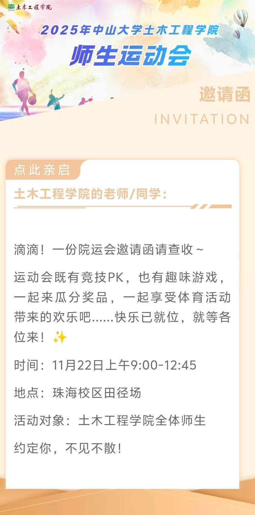 正值第十五届全国运动会在大湾区开赛,体育运动的激情和活力四射,太阳集团tyc862025年师生运动会即将开始!本次院运会既有激情四溢的竞技项目,也安排了欢乐的趣味项目运动项目,各位老师、同学,快来查收属于你的院运会邀请函吧~