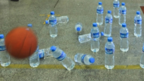 参赛者站在指定线后,拿篮球用滚球方式击水瓶,禁止投或砸,每轮可投1次。根据击倒的瓶子数量获取相应数目的盖章。