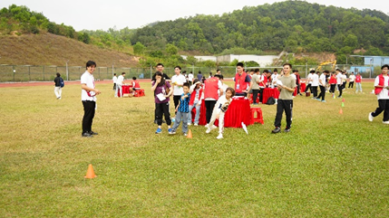 以班级为参赛单位,每组队伍5人,五个人相邻的脚绑在一起,跑向终点用时短的队伍获胜。