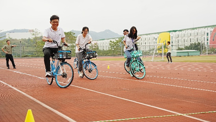 参赛者骑自行车,从起点出发,慢骑车到规定的终点,用时长者为优。如果中途脚落地一次在最终时长减十秒。根据完成时间获得相应数量的盖章。
