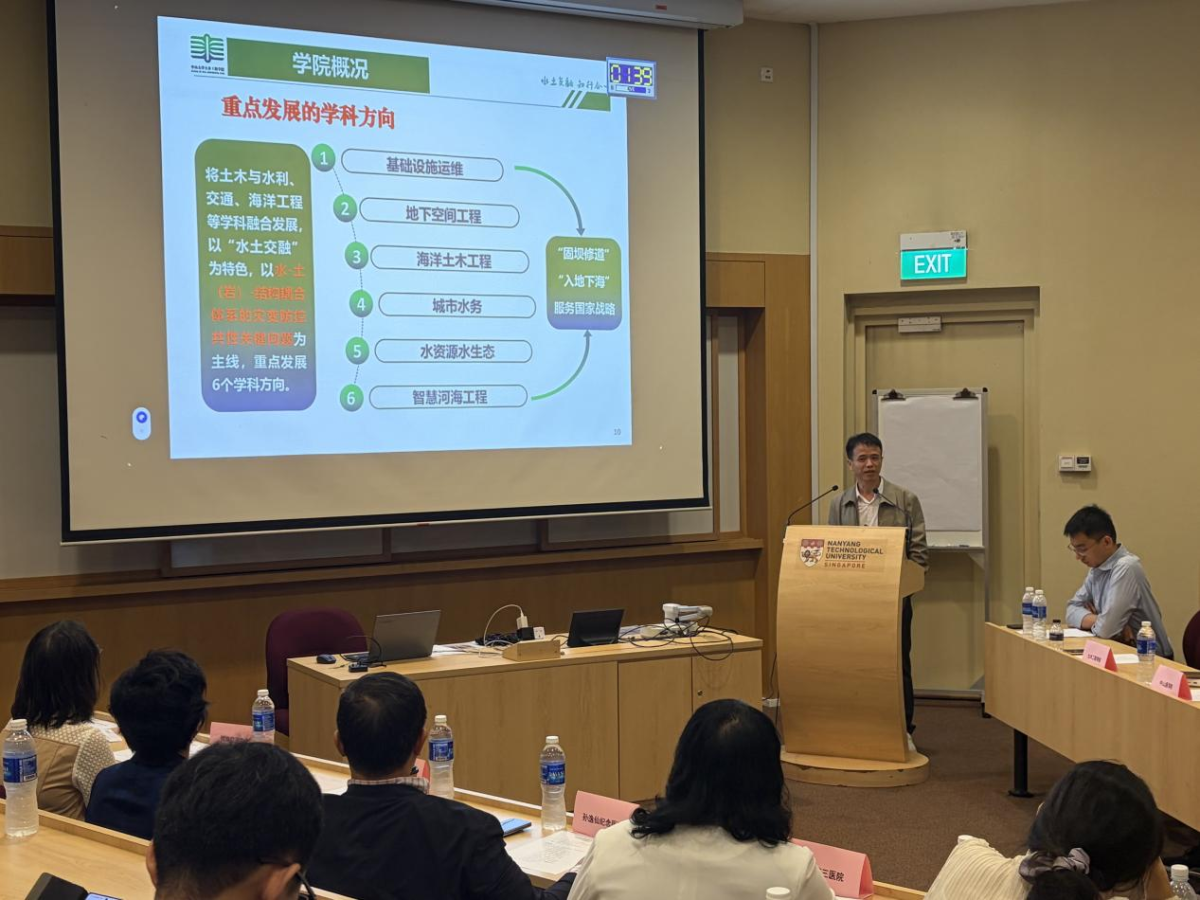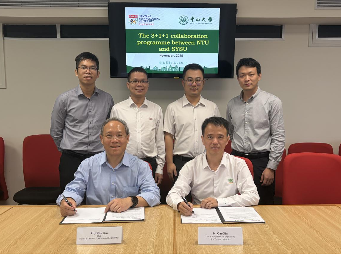 11月14日下午,我院代表团拜访新加坡南洋理工大学,与南洋理工大学土木与环境工程学院院长楚剑教授、朱峰副教授、史超助理教授座谈交流。我院党委曹新书记代表学院与新加坡南洋理工大学土木与环境工程学院楚剑院长签署两校“3+1+1”学生联合培养协议,双方就后续项目的开展做进一步的探讨和落实。计划2026年1月遴选我院大三学生,在他们完成本科3年的学习后,2026年9月前往新加坡南洋理工大学修读课程,同时完成本科学位论文,2027年9月继续在新加坡南洋理工大学完成硕士的课程学习及学位论文。参与该联合培养项目并按要求完成学业的学生将获得我校工学学士学位和新加坡南洋理工大学理学/工程硕士学位。