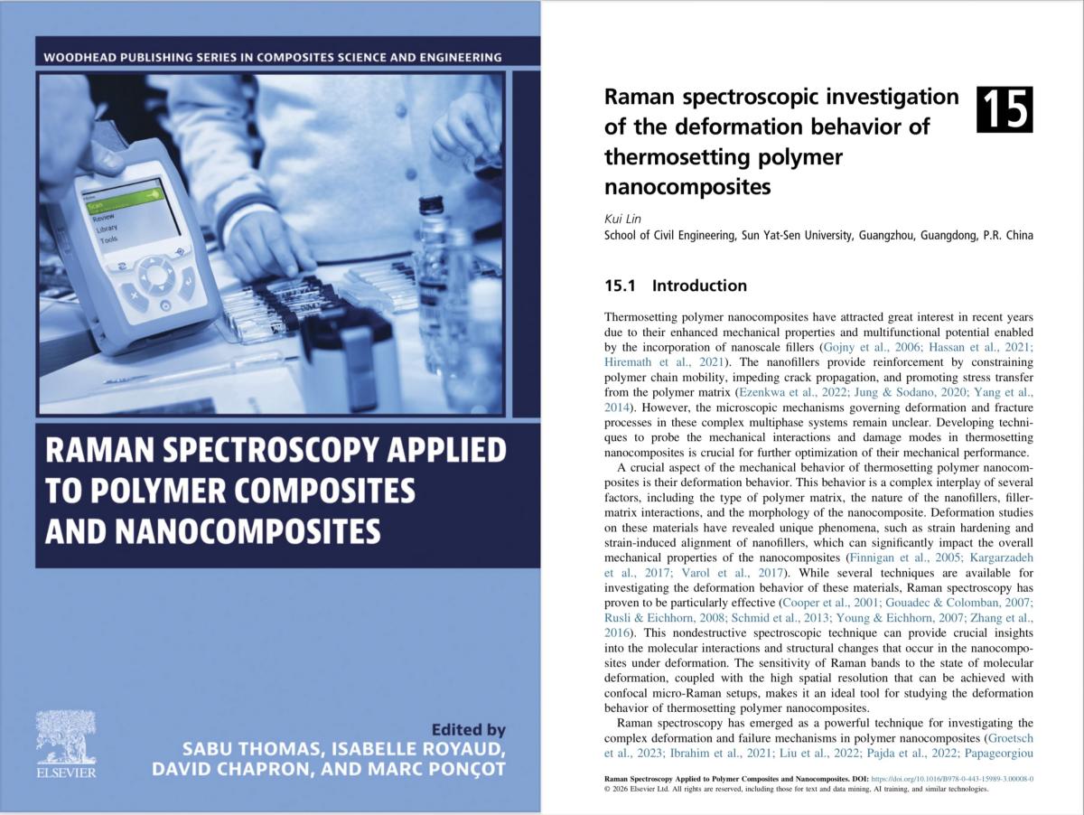 - Kui Lin*, Raman spectroscopic investigation of the deformation behaviour of thermosetting polymer nanocomposites, Raman Spectroscopy Applied to Polymer Composites and Nanocomposites, Woodhead Publishing Series in Composites Science and Engineering2026, Pages 513-545.